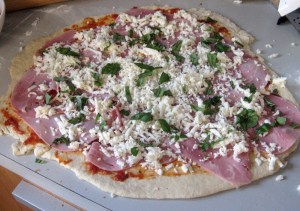 - Add the tomatoes, ham, grated mozzarella and fresh basil. Black Pepper.