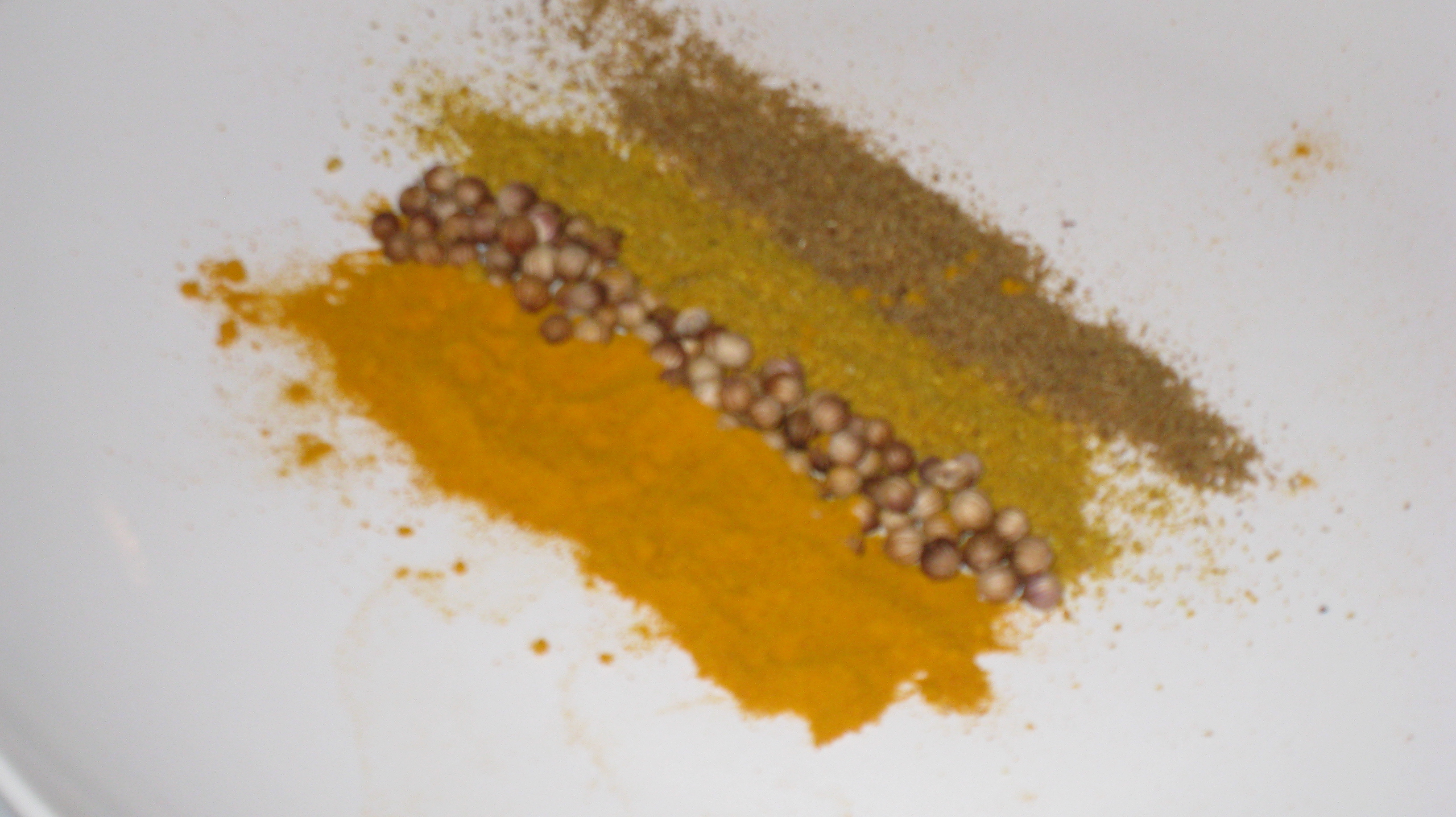- Pop all the spices into the pestle and mortar. Give them a right royal bashing up so that they are all mixed together and ALL the coriander seeds are really crushed! Add the garlic and bash some more!