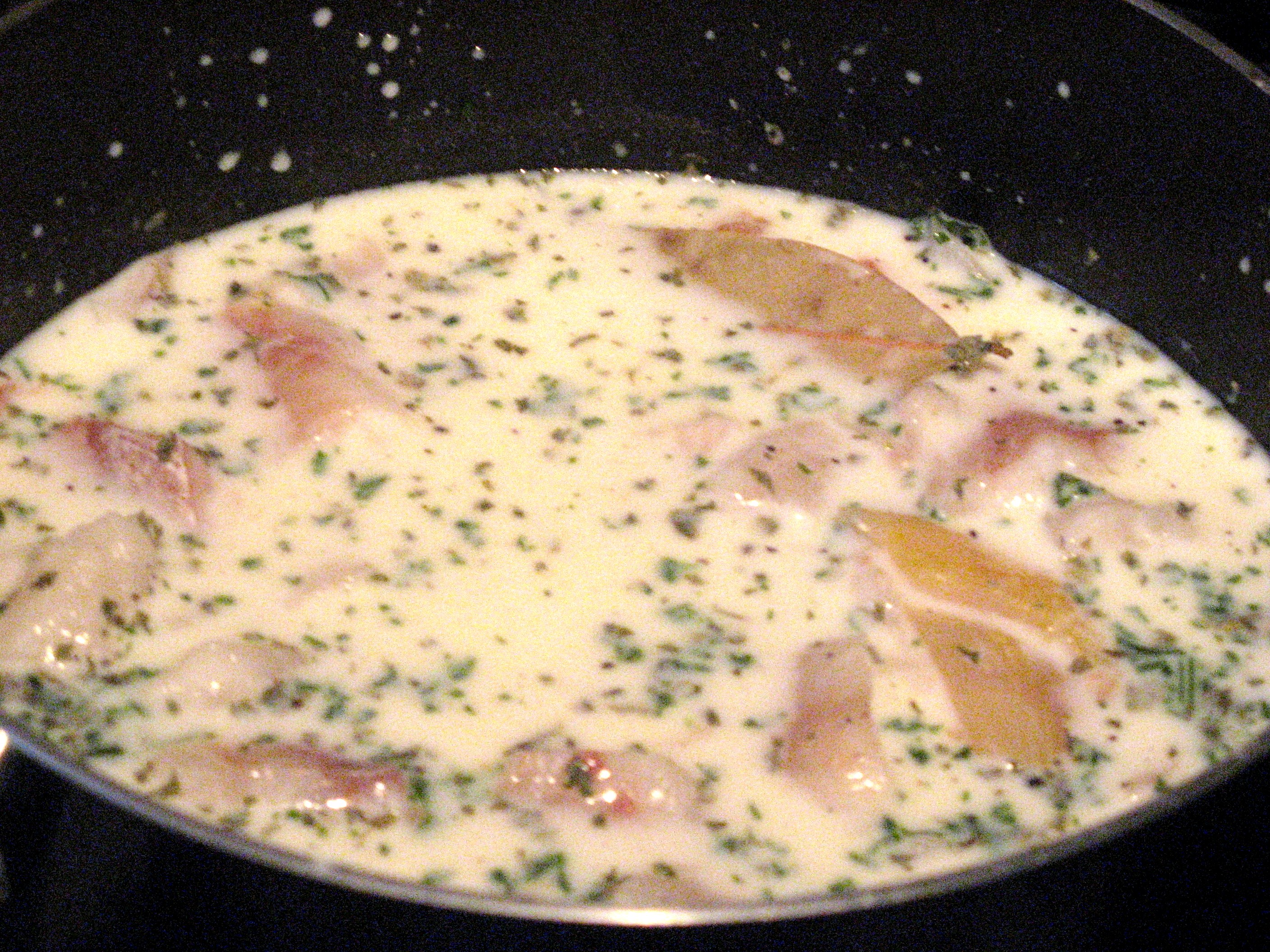 - Place all the fish, 1/2 pint of the milk, wine, garlic, bay leaves, parsley & seasoning into a saucepan and heat until boiling