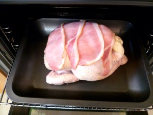 - Drape bacon rashers over the chicken and pop it in the oven for an hour and a half