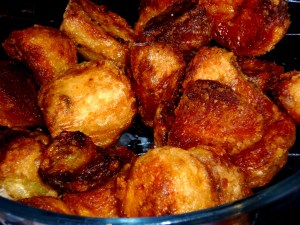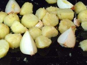 - take the tray with the fat or oil on it out of the oven and tip the ‘fluffed’ potatoes on to the try. It will spit so stand back so you don’t get burnt or hot fat onto your clothes