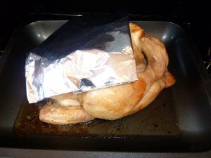 - After about 20 minutes the bacon will be done so take it off and set it aside, put a square of kitchen foil over the spot where the bacon was, this will make sure the chicken doesn’t go dry. While you have the oven door open place a the roasting tray for your potatoes in the oven with either a very very generous slosh of Olive oil, or 2 very large tablespoons of duck or goose fat (the fat needs to be dangerously hot when you put your potatoes in)