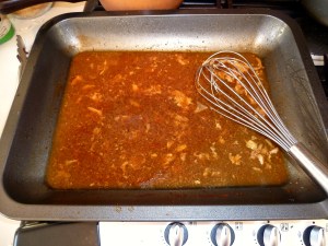 - Put it on hob, heat and with a wooden spoon scrap the sticky yumminess off the bottom of the tin.