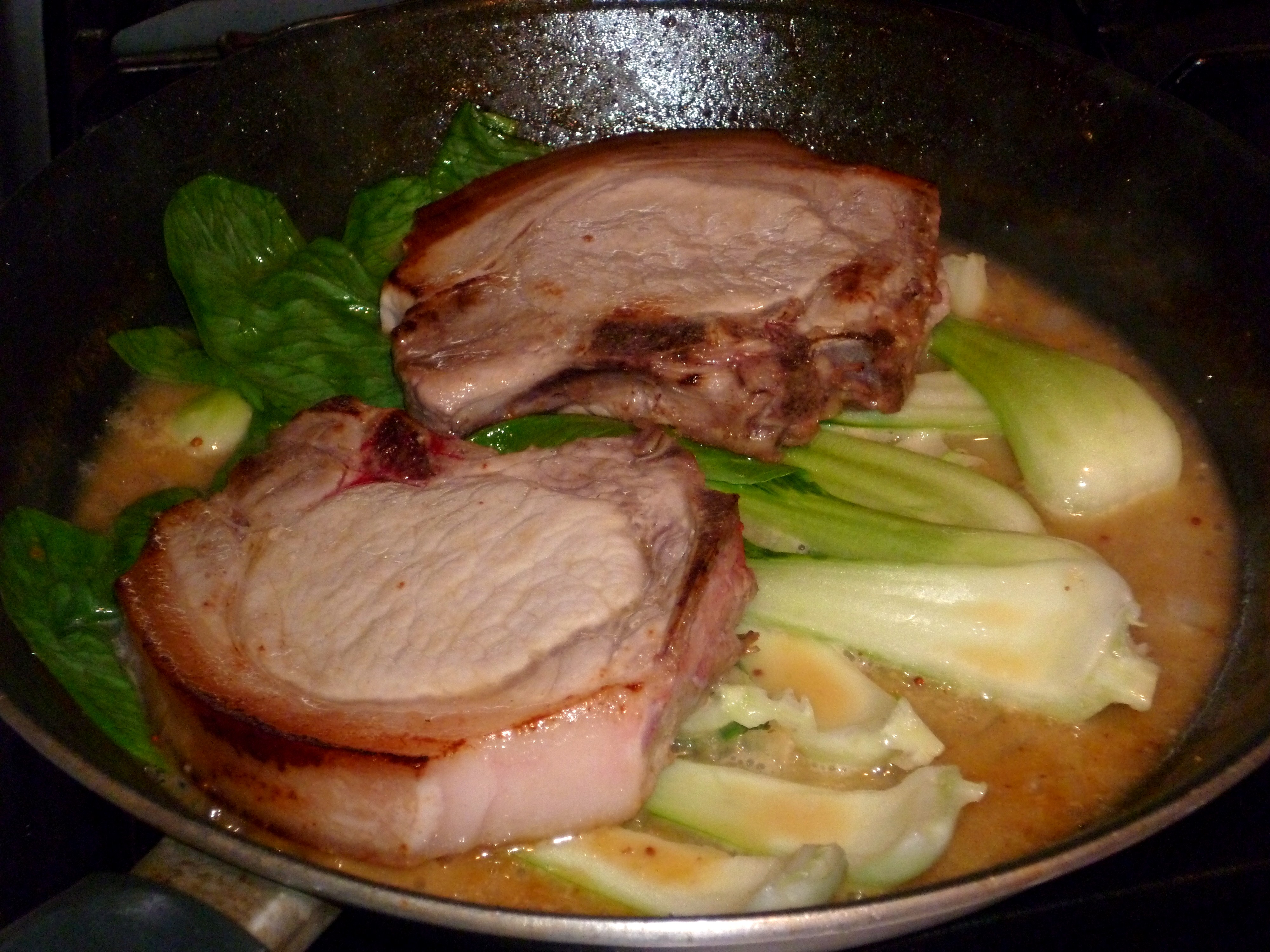 - Add the pak choi to the cooking liquor and place the chops on top