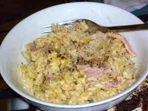 I got in from my quick few drinkies and decided that I really did not want the healthy (ish) cuppa-soup that I had been planning; and plumped for the non taxing carbonara.