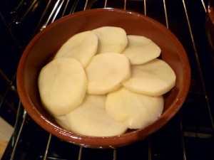 - Peel, thinly slice and arrange the potatoes on top of the lamb mix