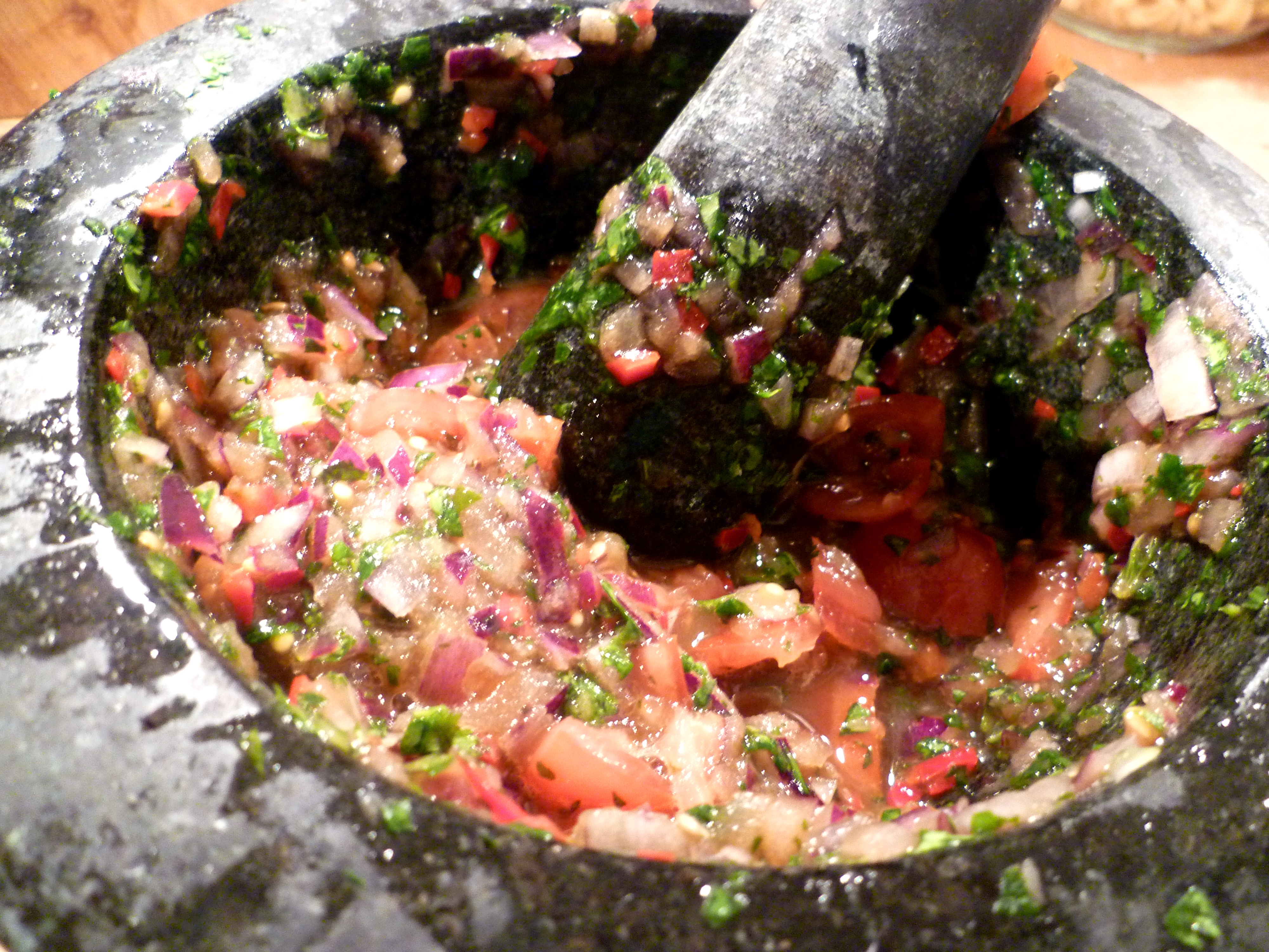 - Chop the tomatoes into small chunks and add them to the mortar
