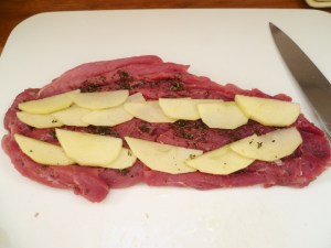 - Peel and finely slice the apple and place the slices in 2 lines lengthways along. the tenderloin