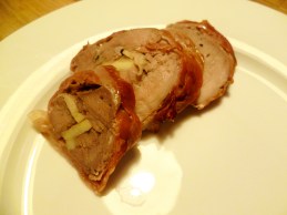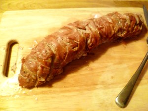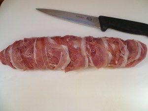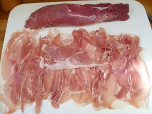 - Lay out the prosciutto below the loin trying to get the pieces over-lapping