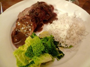 I served this with a red wine and mushroom sauce which was only ok – I would recommend a creamy mushroom sauce with lots of thyme. The best way to do this would be to get a small pot of double cream and a packet of chestnut mushrooms, a knob of butter, a small garlic clove and lots of thyme fresh thyme. Chop up the mushrooms as small as yon want (I would ‘finely’ chop them). In a small saucepan melt the butter, add the mushrooms, garlic and thyme and fry the lot off for 5 minutes so the mushrooms let all their juice out and shrink, add the cream and some vegetable stock, bring to the boil. Simmer for 10 minutes, season with pepper.