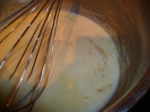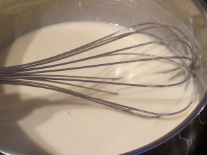 - Turn up the heat a little and add the milk in 3 batches, stirring all the time with the whisk