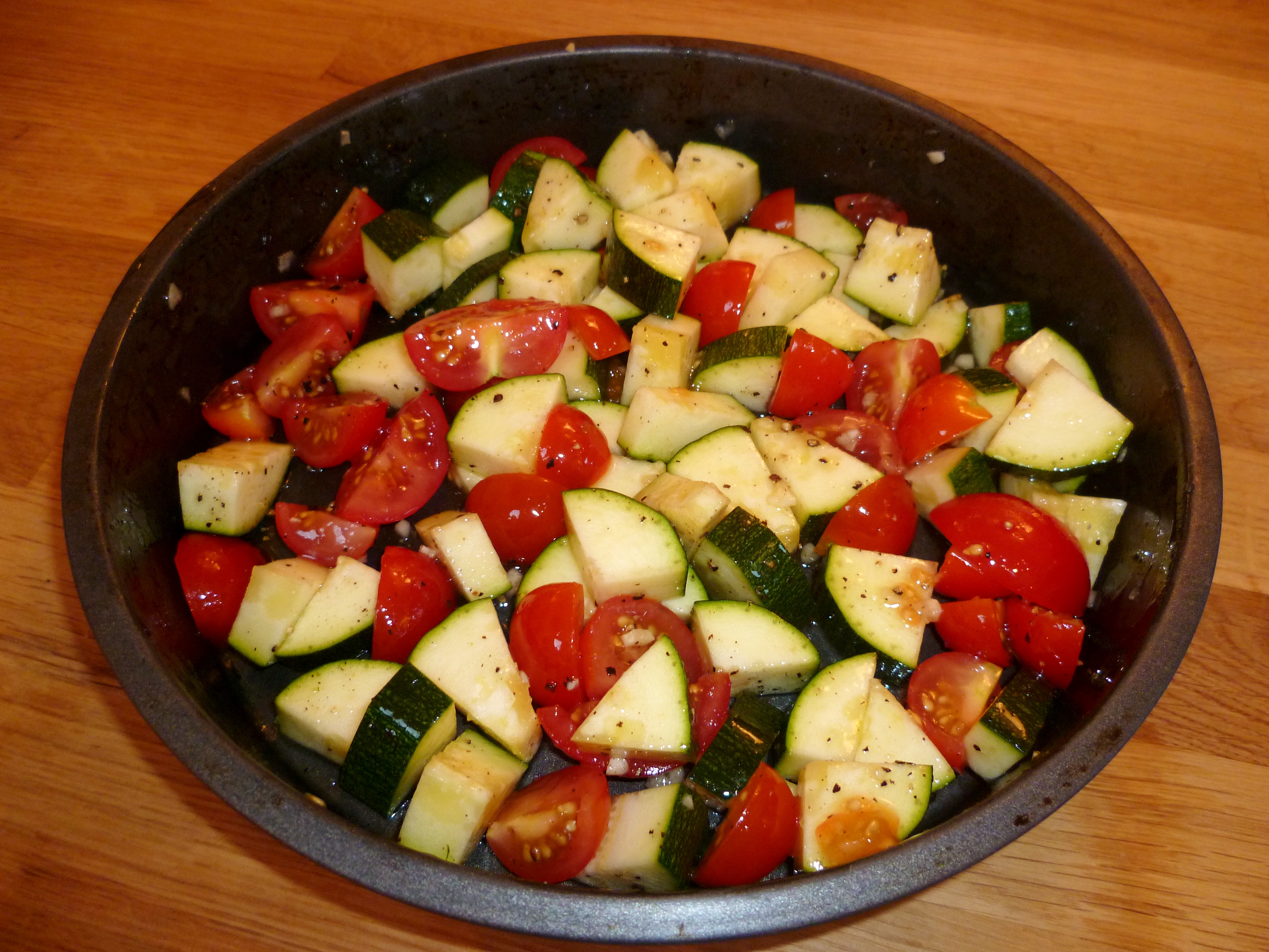 - Quarter the cherry tomatoes