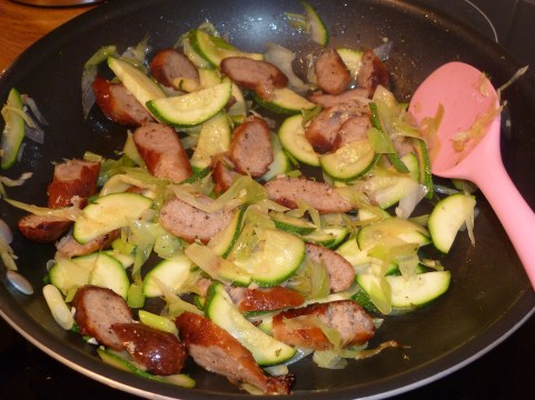 - Over a low heat add the white sauce to the sausage, courgette and leak mix