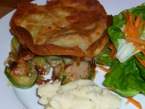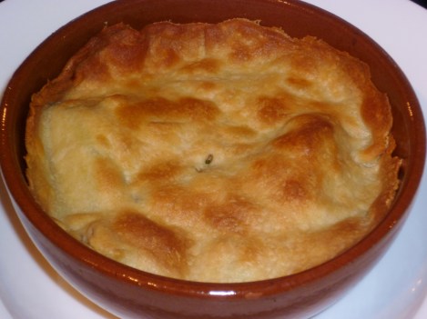 - Pour it into your oven proof dish or dishes and top with the pastry. When I made this it didn’t come up as high in the dish as I’d expected it to, but don’t panic if this happened just place the pastry over filling anyway and press it against the sides to form a seal