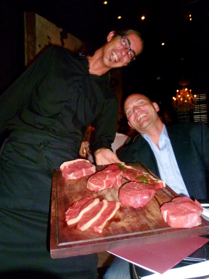We were seated at our table which was teeny and not in the greatest position in the room, but then I imagine that is the luck of the draw. Greg – our hugely enthusiastic waiter – welcomed us and talked us through the menu and wine list, then brought us a board of raw steaks so we could see what was what.