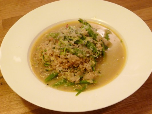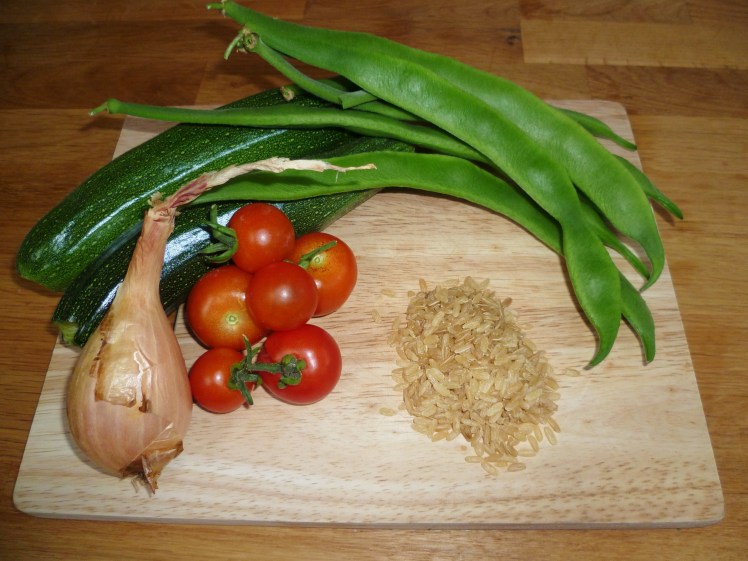 Ok so this isn’t the prettiest of dishes but it tastes gorgeous, is good for you AND if you’re going for a meat free meal once a week (ok, chicken stock isn’t technically vegetarian) – this is perfect. Oh, and – for my part – I grew the courgettes, beans and tomatoes myself, I used a shallot from the Boyfriend’s parent’s house, so it’s a pretty cheap dish (brown rice isn’t exactly expensive). Might make it again next week.