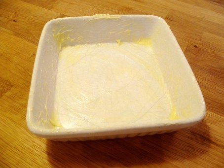 - Get your dish. For this I used a 6inch square dish and using some cling film or kitchen roll, squidge the butter round your baking dish, being sure to get all the sides and corners greased