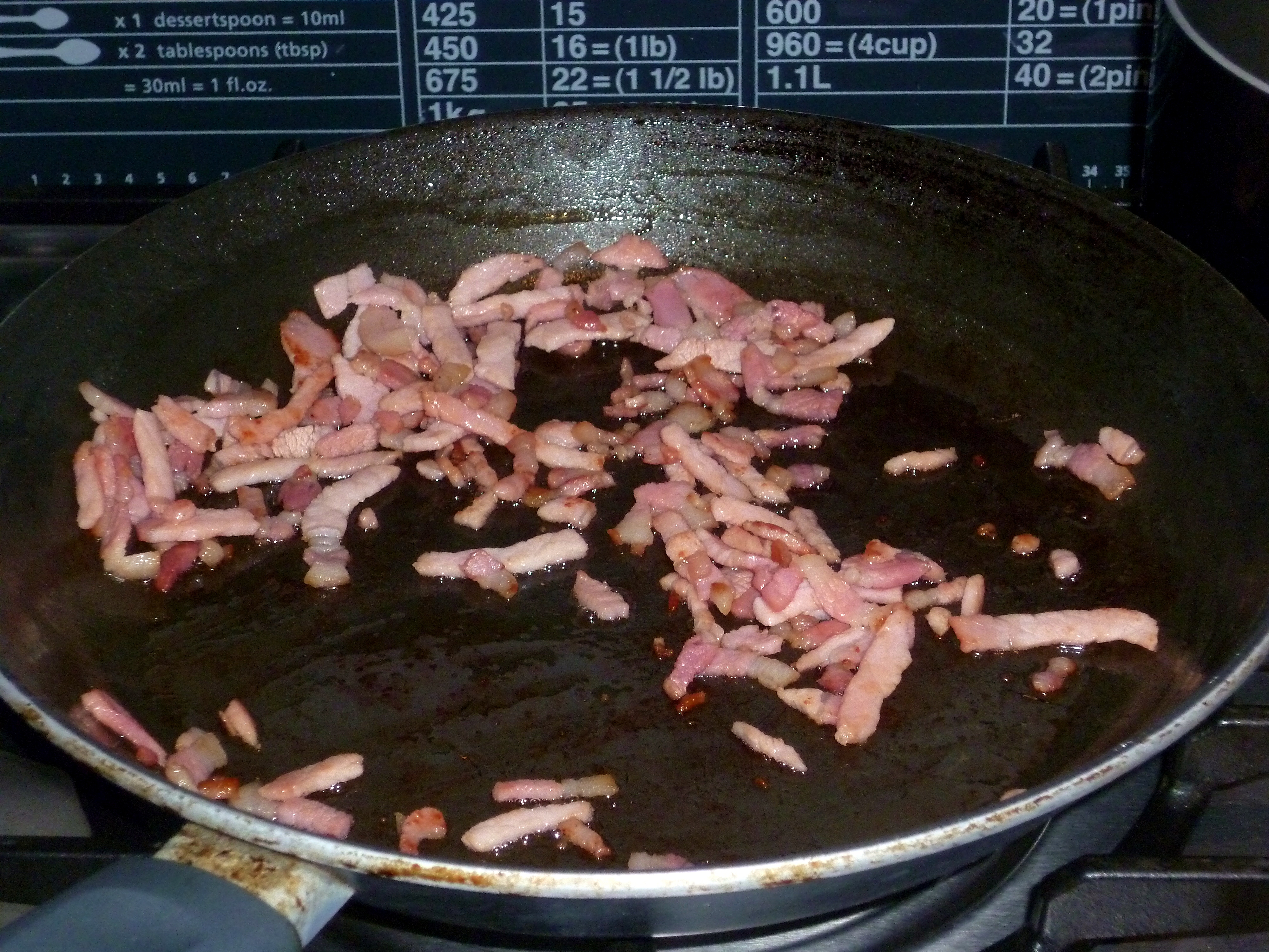 - Tip the bacon bits into the pan with the beans and turn on the heat to it’s lowest