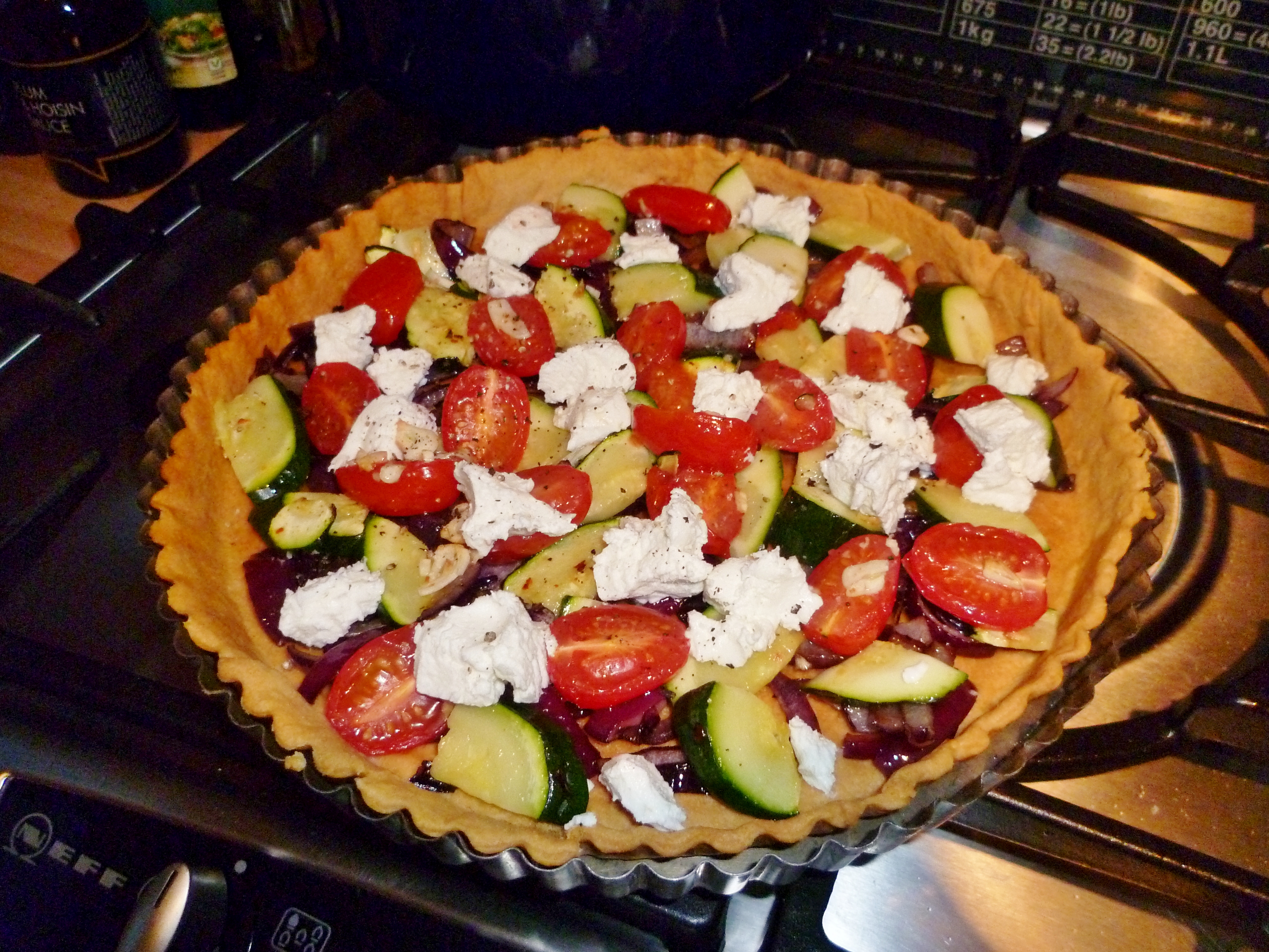 • Once the pastry is blind baked, remove the beads and spread the vegetables out in it – if you were being cheffy you could ‘arrange’ them. If not, just ‘make look nice’ and plop lumps of the goats cheese in the case as well.