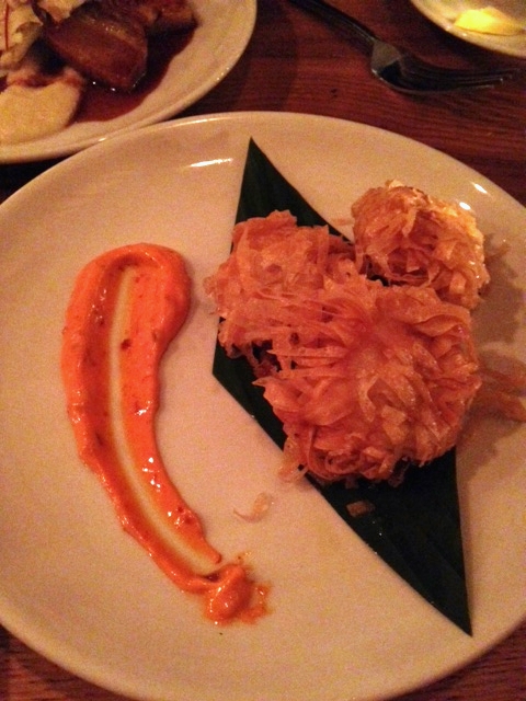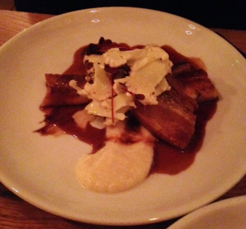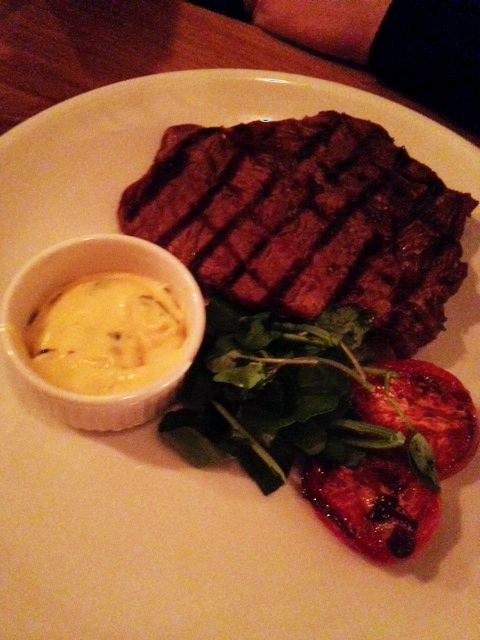 For starters we went against the waitresses advice of ordering one each and ordered 4 between us (yep, we had main courses too). Rabbit with polenta and Parmesan, pork belly with cauliflower purée, duck egg with purple sprouting and almonds and finally scallops in filo with Harissa Mayo. All great, of the four the pork belly was the weakest and the clear winner was the scallops – they were perfectly cooked in deep-fried grated filo pastry. Main courses came in the form of a steak with garlic mash and the guinea fowl.
