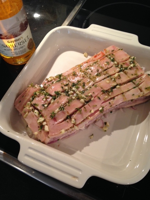 - Pour 2/3 of the cider around the pork belly and place in the oven for 30 minutes (NOT over the top, don’t want to wash off the garlicky goodness)