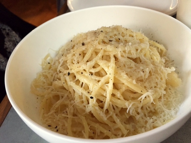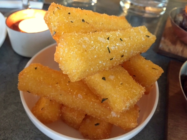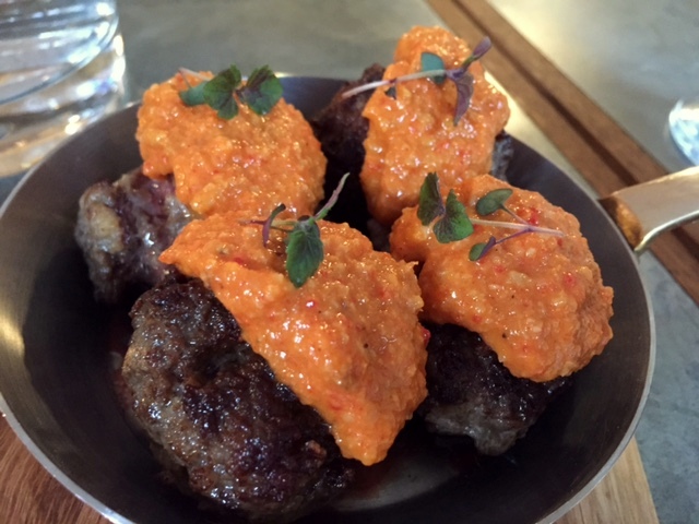 On to the balls. Wagyu balls with Romesco sauce first, served lovely and pink with not too much sauce as to drown the taste of the beef – I do wonder if there is any point in using such high quality beef for meatballs, but maybe I’m just an old cynic. The pork, ricotta, Parmesan, piney nut, basil and sage balls with benchmark sauce were lush. That’s my kind a ball, porky and creamy. A side of spaghetti and polenta chips were ordered as well – both of which were good.